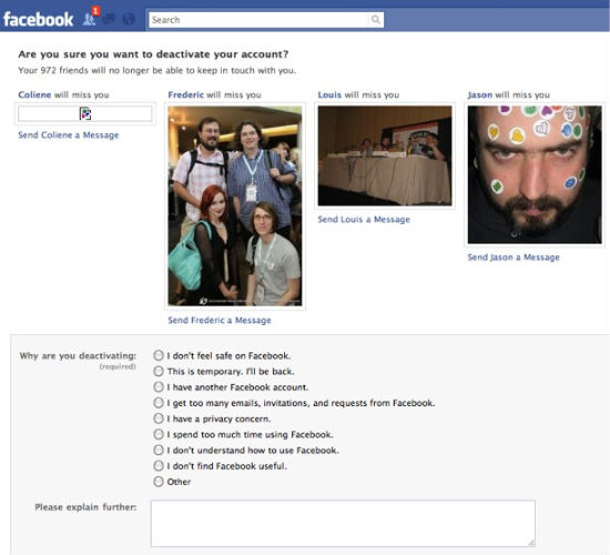 Chiudere completamente il proprio profilo su Facebook non è la cosa più facile di questo mondo, e se ne discute da quando nacque Facebook. Intanto il sistema richiede diversi passaggi e non sempre porta alla totale cancellazione dei propri dati. E poi, se su centinaia di milioni di utenti qualcuno decide di andarsene ogni giorno, il messaggio di addio di Facebook fa di tutto per fargli cambiare idea, stando a quanto racconta ReadWriteWeb.