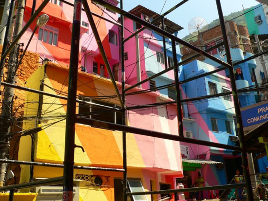 Santa Marta è un complesso di favelas nel cuore di Rio de Janeiro, e durante gli ultimi mesi è stata teatro, protagonista e sfondo di una mastodontica opera d’arte che ha trasformato Praça Cantão, piazza d’ingresso alla baraccopoli, da luogo malfamato e fatiscente a vero e proprio landmark urbano. 34 case sono state dipinte con una fantasia di raggi colorati, diventando parte del più ampio progetto “Favela Painting” dei due artisti olandesi Haas&Hahn (Jeroen Koolhaas e Dre Urhahn): l’obiettivo è di trasformare le zone più problematiche e marginali in un monumento che sia parte integrante dell’immagine di Rio, al livello del Cristo Redentore e del Pan di Zucchero, migliorando non solo le vite degli abitanti del luogo ma anche la percezione delle favelas nell’immaginario collettivo. Grazie alla risonanza mediatica dell’iniziativa si è anche riusciti ad attirare l’attenzione sulle terribili condizioni delle baraccopoli: l’idea è di arrivare a dipingere tutta la favela di Santa Marta, per poi esportare il progetto in altre favelas brasiliane e nel resto del mondo.
