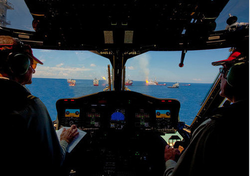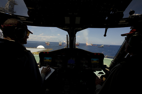 Questa foto invece – ritoccata – sembrerebbe mostrare un elicottero dirigersi sul luogo dell’esplosione della Deepwater Horizon, mentre sul posto si stanno ancora cercando di spegnere gli incendi.