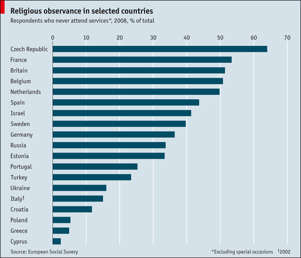 Nella sua ricca sezione di grafici e statistiche, l’Economist ha pubblicato una classifica dei paesi europei per frequentazione delle funzioni religiose. Le barre indicano la percentuale di interpellati dallo European Social Survey che ha risposto di non andare mai a messa, salvo occasioni speciali come matrimoni o battesimi o funerali.