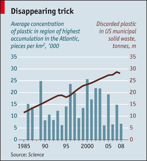 La quantità di plastica prodotta nel mondo è aumentata di cinque volte tra il 1976 e il 2008, e l’ammontare di rifiuti buttati dagli americani è quadruplicato tra il 1980 e il 2008. È dunque ragionevole assumere che, quando la quantità di plastica buttata aumenta, anche l’inquinamento degli oceani diventa maggiore. Ragionevole, ma a quanto sembra sbagliato. Secondo uno studio durato 22 anni sull’Atlantico del nord e l’area dei Caraibi, e pubblicato di recente su Science, le cose non stanno più peggiorando. Kara Law della Sea Education Association di Woods Hole, Massachusetts (USA), e i suoi colleghi hanno scoperto che tra il 1986 e il 2008 non c’è stato un aumento nella concertazione di plastica nelle zone da loro analizzate.