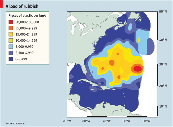 Nella porzione di oceano Pacifico che si trova tra la California e le isole Hawaii nel 1997 fu scoperto per la prima volta il “Pacific Trash Vortex”, una sterminata macchia di rifiuti che galleggia sulle acque grande quanto il Texas. Nell’oceano Atlantico esiste qualcosa di analogo: un enorme ammasso di rifiuti che si ritrova a sud delle isole Bermuda creato dalle correnti marine, che trasportano per centinaia di chilometri i rifiuti prodotti nel Nord America. Queste isole artificiali di immondizia sono una condanna per molti animali come i delfini e le tartarughe, ma secondo l’Economist le cose starebbero migliorando, almeno nell’Atlantico.
