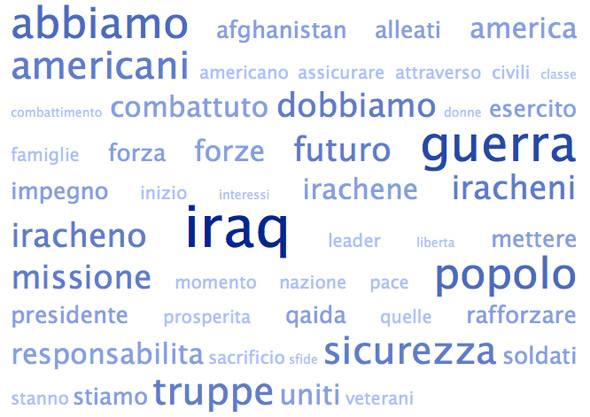 L’immagine qui sotto è la rappresentazione visiva del discorso alla nazione del presidente statunitense sul ritiro delle truppe dall’Iraq. La “tag cloud” comprende le parole più utilizzate da Obama e citate almeno tre volte durante il proprio discorso. Le parole “Iraq” e “guerra” sono inevitabilmente preponderanti e superano di gran lunga la parola “pace”. Obama ha orientato il proprio discorso verso il futuro e la sicurezza del paese invaso nel 2003. Da notare l’utilizzo dei verbi “abbiamo” e “dobbiamo”, dunque in prima persona plurale per coinvolgere maggiormente i cittadini statunitensi.