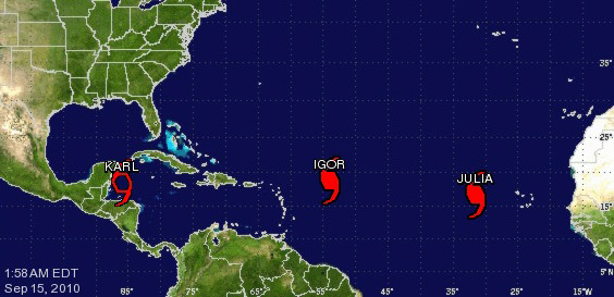 La stagione degli uragani davanti alle coste atlantiche del Centro e Nordamerica continua dopo gli scampati pericoli delle settimane scorse che hanno visto i danni a terra più moderati di quello che si temeva. In questi giorni ancora tre uragani si sono formati sull’Atlantico: due di loro, Igor e Julia, sono al momento tutti stabilmente sopra l’Oceano Atlantico e le previsioni sono che ci dovrebbero restare pur muovendosi verso ovest, mentre Karl – attualmente rubricato a ciclone tropicale – si trova già nel Mar dei Caraibi di fronte alla penisola dello Yucatan che dovrebbe attraversare perdendo di intensità, ma ci si aspetta che riprenda forza (e sia riclassificato come uragano) nelle successive 48 ore avvicinandosi alla zona di Tampico, sempre in Messico. Tutti e tre i fenomeni sono visibili assieme in questa foto scattata dal satellite GOES-13 della NASA.