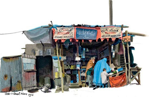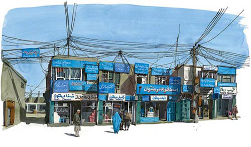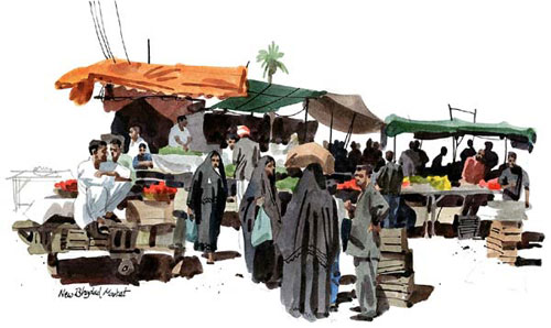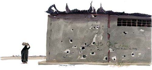 Matthew Cook è un artista arruolato nel British Army, l’esercito della Gran Bretagna. Negli ultimi anni è stato più volte in missione in Iraq e in Afghanistan come comandante di una sezione delle forze armate di terra, il Territorial Army. Ogni volta, appena aveva un momento libero, si metteva a disegnare con gli acquerelli su un foglio di carta quello che vedeva intorno a sé. Accampamenti, carri armati, elicotteri, mercati, donne, bambini.