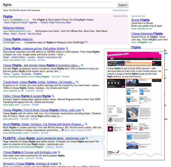 Patrick Altoft, un esperto di SEO (Search Engine Optimization) britannico, ha notato la nuova funzionalità e l’ha segnalata sul proprio blog pubblicando alcune schermate della nuova pagina dei risultati. In pratica, quando fai scorrere il cursore del mouse su uno dei link forniti da Google in risposta a una tua ricerca, intorno al link compare una cornice azzurra, mentre sulla destra dello schermo appare un’anteprima della pagina web relativa al collegamento offerto dal motore di ricerca.