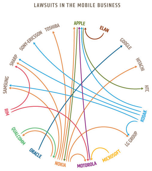 Il grafico qui sotto è stato realizzato da Design Language News e mostra chi ha denunciato chi nel settore della telefonia mobile. L’elaborazione grafica è il tentativo di rendere più chiaro e leggibile un diagramma pubblicato dal britannico Guardian. Apple è una delle società che ha attirato contro di sé il maggior numero di cause legali, mentre Nokia si dimostra molto combattiva: nel grafico sono indicate ben otto iniziative legali contro altrettanti concorrenti. Chi se la passa meglio sembra essere RIM, il produttore dei BlackBerry, ha avviato una causa contro Sharp e una contro Motorola, ma non ha grandi iniziative legali contro come i concorrenti. Destino condiviso da alcune altre società come Microsoft, che però conta numerose altre iniziative legali in altri settori del mercato, come quello informatico.