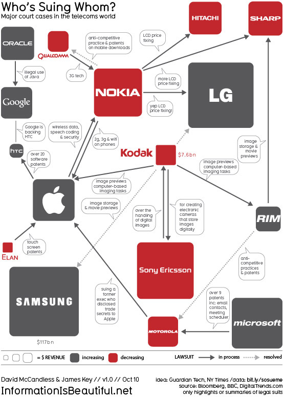I designer di Information is Beautiful hanno realizzato un grafico più elaborato per illustrare le medesime cause legali. In questo caso, però, i fumetti illustrano anche quale sia l’oggetto del contendere delle singole iniziative legali.