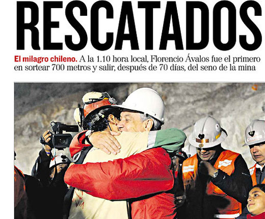 16.38. Il Wall Street Journal ha raccolto qualcuna delle prime pagine dei quotidiani cileni di oggi, tutte ovviamente dedicate al recupero dei minatori.