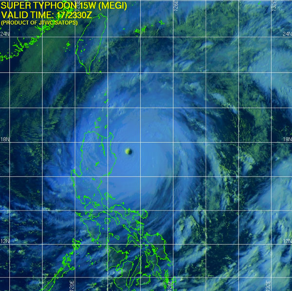 Il super tifone Megi — denominato anche Juan — ha raggiunto il nord delle Filippine, colpendo l’area con piogge forti e venti a oltre 225 chilometri orari. Migliaia di case sono state evacuate e tutto il paese è in allerta, Megi è la tempesta più forte che la nazione affronta dal 2006, quando venti a 155 chilometri orari distrussero i villaggi uccidendo un migliaio di persone.