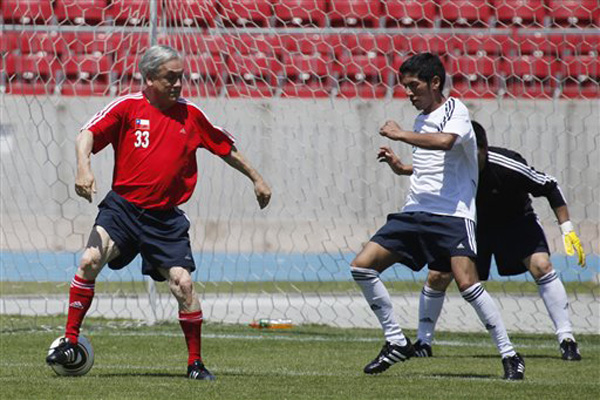 Lunedì è stato il giorno della consegna delle onorificenze nazionali, per i 33 minatori cileni soccorsi due settimane fa dopo 69 giorni di isolamento in una miniera bloccata da un crollo. Ma la celebrazione dell’impresa nazionale che ha catturato l’attenzione del mondo prosegue, e dopo la premiazione è stata la volta della partita di calcio allo Stadio Nazionale di Santiago a cui hanno partecipato alcuni minatori, alcuni soccorritori e l’immancabile presidente Pinera, qui in una fase di gioco col minatore Jimmy Sanchez.