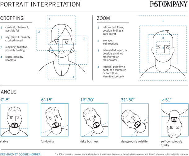 FastCompany ha elaborato una divertente infografica che spiega come interpretare le foto dei vostri contatti: un volto inclinato di 15° appartiene a una persona che ama il divertimento, se non è inquadrata la fronte potrebbe trattarsi di qualcuno che tenta di nascondere un’incipiente calvizie, se compare solo un occhio il soggetto è timido o ha un grosso naso aquilino. Qui trovate l’infografica completa: l’autore, Doogie Horner, ci tiene a puntualizzare che «nel 2% dei casi, il taglio e l’angolazione della foto sono dovuti a ubriachezza, pigrizia o completa mancanza di talento artistico, e non si riflettono affatto sul carattere del soggetto.»