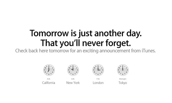 Domani, alle quattro del pomeriggio Apple farà un annuncio «che non dimenticherete mai». La società ha da poco pubblicato un misterioso messaggio sulla homepage del proprio sito web, invitando utenti e appassionati a collegarsi martedì per un annuncio «entusiasmante» che interessa iTunes, il programma per gestire le proprie librerie video e musicali e per acquistare canzoni e film direttamente online. Difficile dire se si tratterà di qualcosa di veramente epocale, ma le ipotesi su quanto sarà presentato non mancano.