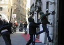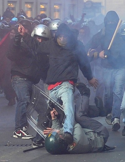 A quel punto però sono cominciati gli scontri tra forze dell’ordine e piccoli gruppi di manifestanti, soprattutto quelli appartenenti ai centri sociali. Molti scontri attorno al Senato, dove una bomba carta è stata lanciata vicino a Ottaviano Del Turco. Diverse altre bombe carta sono state lanciate contro le forze dell’ordine che avevano transennato la zona. Scontri a vicolo del Grottino, a due passi da via del Corso, dove un gruppo di persone con caschi e scudi ha assaltato tre furgoni della Guardia di Finanza. Qui ancora lanci di pietre e bastoni, assalti con mazze e bombe carta. Le forze dell’ordine hanno risposto con delle cariche e lanciando dei lacrimogeni. Alcuni sassi sono stati tirati anche contro giornalisti e semplici passanti. Il resto sono bancomat e vetrine sfondate, camionette della finanza e automobili bruciate. In piazza del Popolo c’è un grosso incendio. Ci sono quaranta feriti, tra cui tre carabinieri. Dieci persone sono state arrestate. Adesso la situazione sembra tornata tranquilla.