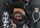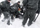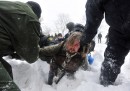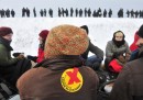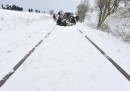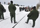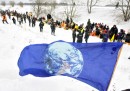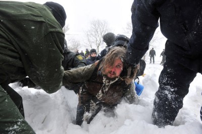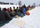Il convoglio è stato rallentato da un gruppo di ambientalisti, che si sono seduti sui binari nel mezzo di una tormenta di neve
