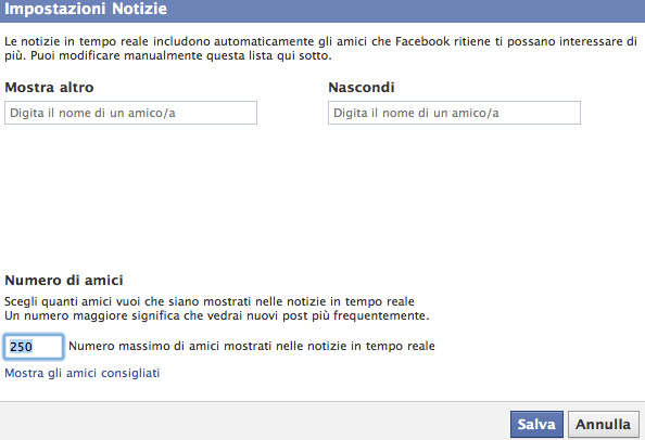 L’area “Impostazioni Notizie” consente di inserire nuovi amici, per vedere i loro aggiornamenti di stato e i contenuti che condividono nella pagina principale di Facebook, e di nasconderne altri. Il sistema consente anche di scegliere il numero di amici le cui notizie saranno visualizzate in tempo reale sul social network. Il valore predefinito è impostato a 250, ma può essere modificato per comprendere un numero maggiore o inferiore di contatti. Naturalmente, più alto sarà il numero di amici, più alta sarà la frequenza degli aggiornamenti visualizzati.