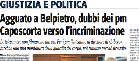 Tre mesi dopo, scrive il Giornale, “i pubblici ministeri si sono fatti un’idea abbastanza precisa”. L’indiscrezione è contenuta in un retroscena di cronaca giudiziaria: va presa con le molle ma va registrata, sia perché in questi giorni si parla di nuovo, per ragioni diverse, di Maurizio Belpietro e di finti attentati, sia perché il Giornale non è certo un giornale che si può assimilare alla sinistra rivale del centrodestra e di Libero. E intanto così scrive oggi.