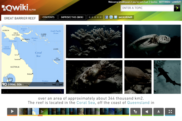 Di Qwiki sappiamo queste cose: che c’entra l’informazione, dato che le parole più ricorrenti nella comunicazione del progetto sono The Information Experience; che ha una versione alpha già online, con qualche esempio della tipologia di contenuti offerti; che contiene la parola “wiki”, e quindi dovremmo aspettarci uno sviluppo collaborativo dei suddetti contenuti da parte degli utenti; che ancora non ne esiste una versione per iPad ed iPhone, dato che è costruito completamente in Flash; che ha vinto il TechCrunch Disrupt 2010, un concorso che premia le idee più innovative del web. Soprattutto, sappiamo che è il progetto su cui ha recentemente investito Eduardo Saverin, il co-fondatore di Facebook recentemente arricchitosi, più che per i meriti nello sviluppo del fortunato social network, per aver vinto la causa dopo esserne stato tagliato fuori.
