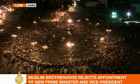 18.45 Nel frattempo è andata in onda una conferenza stampa della presidenza del parlamento. Lo speaker, Fathi Suroor, ha detto che “il precedente governo non è riuscito a rispondere alle richieste del parlamento”. Secondo Ahmad al-Raysuni dell’Organizzazione della Conferenza Islamica, Mubarak ha nominato un gabinetto di guerra.