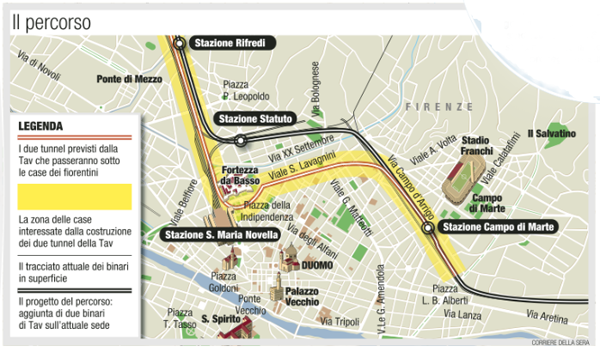 Sul Corriere della Sera di oggi, Marco Gasperetti racconta cosa succede a Firenze riguardo un controverso progetto di costruzione di un tunnel e di una stazione ferroviaria sotto il centro della città. Il progetto è stato di fatto ereditato sia dal sindaco Matteo Renzi che dal presidente della regione, Enrico Rossi, che ora stanno chiedendo al governo delle “opera di compensazione” e non sembrano essere del tutto convinti. Il Corriere propone anche una mappa, che mostra quale sarebbe il passaggio del tunnel e quindi l’incidenza dei lavori sulla città.