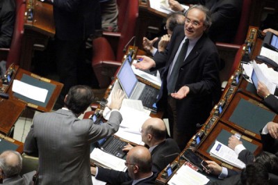 I gesti di Casini, Alfano spazientito e i deputati dell'Italia dei Valori col suo tesserino in mano