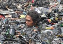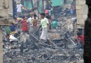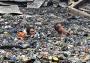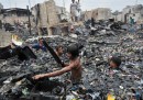 Gli abitanti di una baraccopoli filippina cercano le loro cose dopo un grande incendio