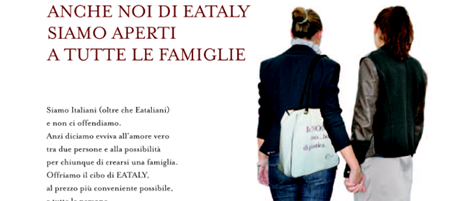 Adesso è Eataly a invitare una “famiglia” composta da due donne che si tengono per mano: ed è esemplare come i temi che dovrebbero essere portati avanti da una politica progressista trovino invece la loro più vistosa rappresentazione nelle iniziative di due società commerciali, tra obiettivi etici ed economici (tra l’altro Eataly annuncia l’apertura dei suoi negozi per il Primo Maggio) che probabilmente si saldano.