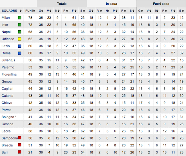 Il Milan ha vinto lo Scudetto e ne abbiamo scritto in abbondanza. L’Udinese ha messo una seria ipoteca sulla qualificazione in Champions League, battendo la Lazio e approfittando del pareggio di ieri contro la Roma. Ora è quarta con 62 punti, mentre Roma e Lazio sono appaiate a 60 punti. La Juventus, se vince stasera, può andare a 59. A fondo classifica, il Brescia è matematicamente retrocesso. Rimane un posto da riempire: la Sampdoria è terzultima a 36 punti ma gioca stasera contro il Genoa uno dei derby più importanti della sua storia. Il Lecce a 38 punti si è tenuto in vita grazie a gran gol di Chevanton, contestato ma regolare. Casistica singolare: due rigori sbagliati in questa giornata, tutti e due molto goffamente, uno da Miccoli e uno da Zarate. Di seguito la classifica, dal sito di Repubblica, poi i video con tutti i gol.