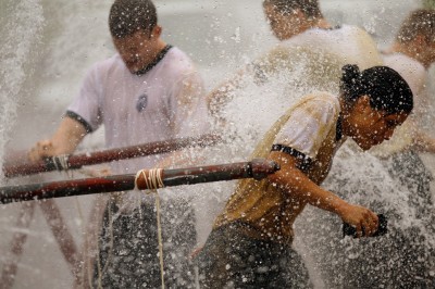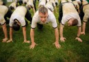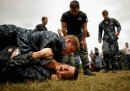 L’addestramento delle matricole è molto duro e prevede 14 ore al giorno di lavoro e 32 diversi tipi di esercitazione, con l’obiettivo di formare gli allievi sia fisicamente che psicologicamente. Queste foto – un po’ cinematografiche ma notevoli – mostrano un repertorio dell’addestramento: studenti del primo anno che fanno gli addominali sollevando dei grossi tronchi, strisciano in canali pieni di fango muniti di elmetto e fucile, resistono distesi a lungo nelle fredde acque del fiume Severn, che costeggia l’accademia.