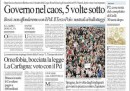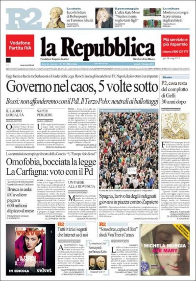 Malgrado quanto sembrasse ieri, i titoli dei giornali di oggi riflettono il fatto che il centrodestra non ha ancora elaborato la sconfitta subita al primo turno delle elezioni amministrative, e sta ancora discutendo più con se stesso che con gli elettori, in vista dei ballottaggi: alcuni titolano sul fatto che Bossi va per la sua strada (“scaglia il primo colpo”, dice il Tempo, illustrando adeguatamente), altri se la prendono col Terzo polo, molti enfatizzano le cinque sconfitte subite ieri dalla maggioranza alla Camera. Libero se la prende con i Responsabili, definiti “Irresponsabili”: buongiorno.