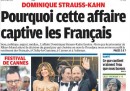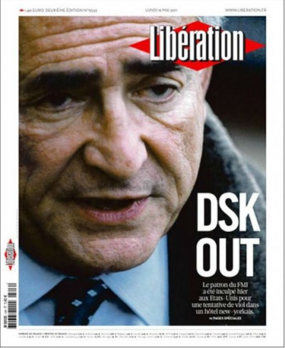 La notizia ha avuto grandissimo risalto sulla stampa francese: dopo diversi giorni, le homepage dei maggiori quotidiani francesi continuano a dedicare la notizia principale a DSK e ospitano decine di analisi, previsioni e retroscena (venerdì 20 maggio il sito di Libération parla ancora solo di questo). I principali quotidiani non sembrano sbilanciarsi troppo sul fronte colpevolista o innocentista (un sondaggio CSA pubblicato mercoledì dice che il 57% dei francesi crede in un complotto), ma inevitabilmente sono rispuntate le varie accuse di molestie che in passato hanno coinvolto DSK, più alcune emerse negli ultimi giorni; le varie teorie del complotto – circolate immediatamente – ricevono oggi poco spazio. I giornali francesi ospitano poi diverse analisi di intellettuali che dimostrano una grande attitudine all’introspezione e alla filosofia, anche a proposito di vicende così “concrete”: ricordiamo, su Libération, le opinioni del filosofo Marc Crepon («DSK, o il carattere dell’intera vita umana») e dello scrittore Percy Kemp («Un’antica e buona soluzione: il potere agli eunuchi»), ma titoli ugualmente speculativi sono anche su Le Monde e Le Figaro: sul primo appare «Una misteriosa autodistruzione», l’analisi di uno psichiatra che insinua la possibilità per DSK di un inconscio desiderio di mettere fine alla propria “epopea” con un gesto tragico e grandioso; nel corso dell’articolo si fa di sfuggita anche un parallelo con Zidane.