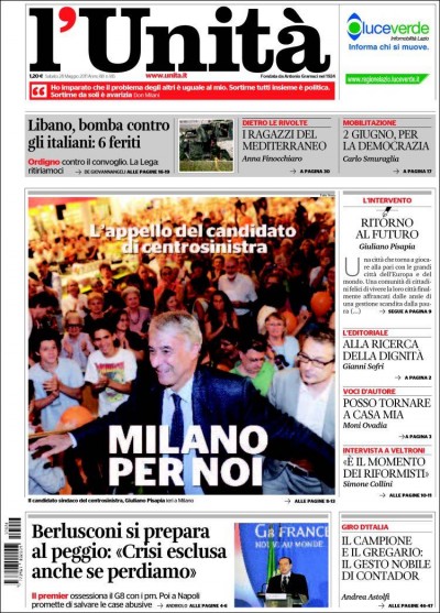 Siamo a un passo dal voto e lo spazio è quasi tutto per Berlusconi che dice che resterà anche in caso di sconfitta a Milano e a Napoli. E naturalmente al G8 rincara la dose sui giudici. Poi c’è la polemica sulla missione dei soldati italiani in Libano dopo l’attacco subito ieri, e la Polverini che urla ancora.