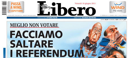 Si aggrovigliano le affinità e le distanze dei quotidiani intorno al referendum. Il Manifesto oggi riscopre il valore delle parole del Papa, ma con un’immagine che l’Osservatore Romano non metterebbe: a proposito, le guardate le prime pagine dell’Osservatore Romano? Sulla qualità delle immagini batte tutti. L’Unità continua con la sua raccolta di “militanze creative”, e Libero apre con una chiamata alle armi che si rivela esattamente ciò a cui si riferiva il Post stamattina.