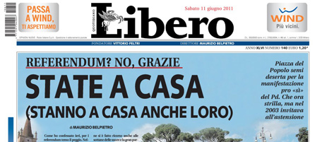 Libero e il Giornale continuano a cercare con grande enfasi di scongiurare la vittoria dei sì ai referendum spiegando ai loro lettori che non devono andare a votare. Repubblica segnala le intercettazioni tra Briatore e Santanché su Berlusconi, con un po’ di sopravvalutazione. Poi ci sono i nuovi aggiornamenti sulle responsabilità dei germogli di legumi nelle infezioni tedesche, le email di Sarah Palin, e altro ancora.