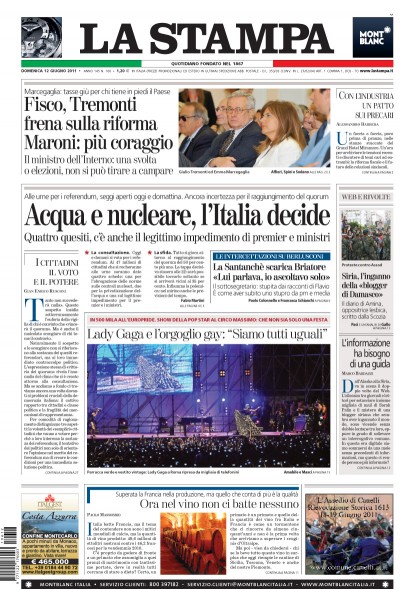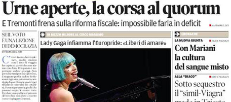 Se a Salerno la notizia principale è il turno dei playoff per la promozione, nel resto del paese i titoli maggiori sono quasi tutti per i referendum, ma le foto di Lady Gaga al Circo Massimo occupano gli spazi più vistosi. Poi c’è Tremonti, e i giornali sportivi che cercano di distrarsi dal caso scommesse.