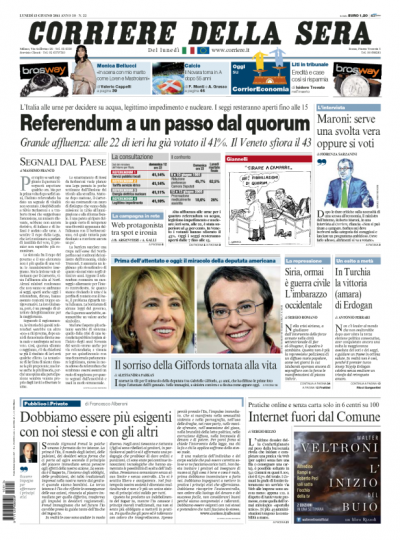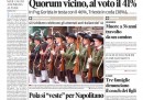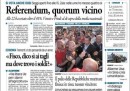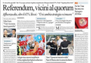 C’è il Giornale che relega le notizia sui dati di affluenza in uno spazio laterale, e c’è il Mattino di Padova che ospita la delusione per la sconfitta della squadra di calcio (su Tuttosport c’è una simmetrica eccitazione per la vittoria del Novara). Ma i titoli maggiori di tutti gli altri quotidiani sono sul quorum vicino nei referendum.