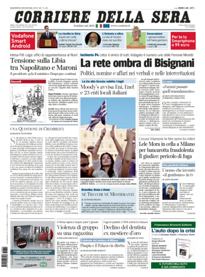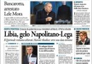 I titoli maggiori delle prime pagine si dedicano alla paludosa politica interna con gli strascichi di questioni tra Lega, PdL e Napolitano, oppure all’inchiesta su Luigi Bisignani. Si racconta di quel che ha dichiarato Gianni Letta ai magistrati, mentre Libero titola sul “vice Letta” (sarebbe Bisignani), e il direttore ne racconta le gesta e chiede se abbiano implicazioni da inchiesta penale. Poi c’è anche spazio per Lele Mora, arrestato ieri a Milano.