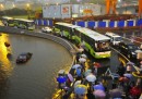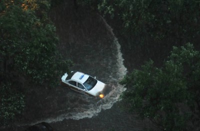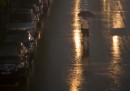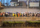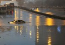 Auto che galleggiano sull'acqua, strade allagate e tanti ombrelli