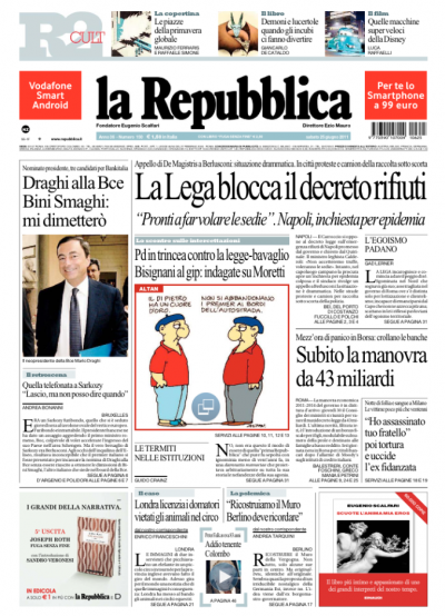 Il coraggioso (ironia) annuncio del governo che il problema dei rifiuti a Napoli sarebbe stato affrontato nel prossimo Consiglio dei Ministri aveva abbastanza spiazzato i siti dei giornali, ieri: che cosa si sarebbe inventato Berlusconi? Ma è arrivata la Lega a contestare iniziative che coinvolgano il resto del paese, e tutto è diventato più facile per i titoli di oggi. Poi c’è la nomina di Mario Draghi alla Banca Centrale Europea, Libero che magnifica il piano di tagli del ministro Tremonti, e Di Pietro che oggi va a spiegare la sua “nuova linea politica” anche al Secolo.