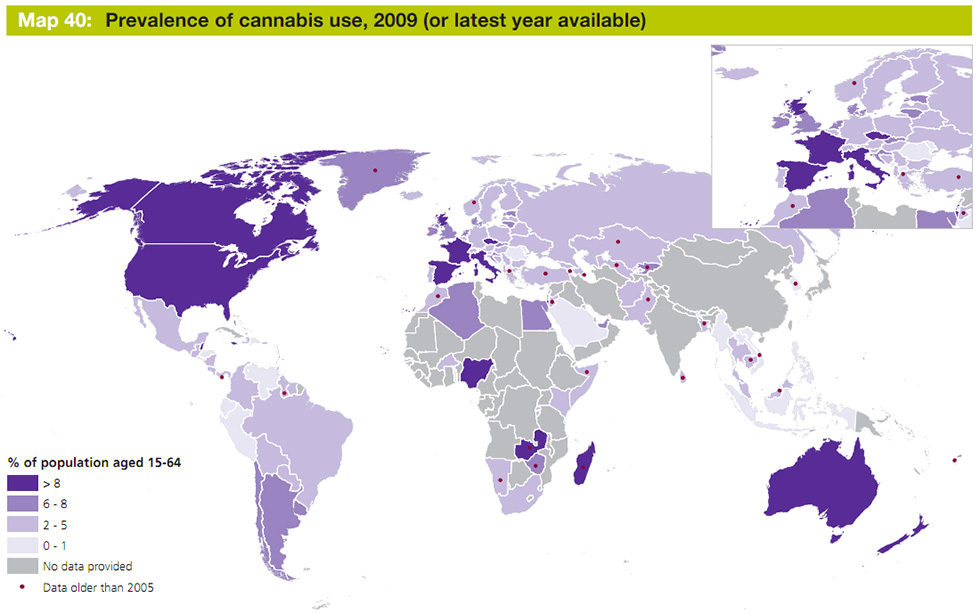 Tra le molte sostanze stupefacenti prese in considerazione dalle Nazioni Unite per il proprio rapporto c’è anche la cannabis. In Europa ci sono tra i 28,7 e i 29,2 milioni di consumatori abituali, pari al 5,2 per cento della popolazione. Nel Nord America la cifra è pari a 32,5 milioni di persone, ovvero il 10,7 per cento della popolazione. A livello mondiale, ci sono almeno 203 milioni di persone che fanno uso di questa sostanza. I principali paesi fornitori di cannabis, non è detto siano necessariamente i principali produttori, sono il Marocco, l’Afghanistan, il Libano, la Spagna, l’India, il Pakistan e i Paesi Bassi.
