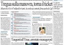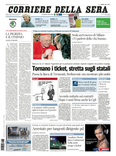 I titoli maggiori delle prime pagine oggi sono dedicati alla “manovra finanziaria” e al “ritorno del ticket”. Il Corriere della Sera sceglie di dare molta visibilità anche al nuovo arcivescovo di Milano, mentre Libero e Giornale scelgono due diversi fronti su cui attaccare l’opposizione e difendere la maggioranza.