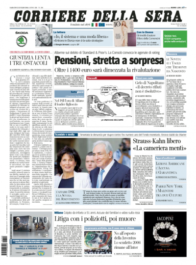 Ci sono due storie che dominano le prime pagine di oggi. La prima è quella relativa a Dominique Strauss-Kahn e alle sorprendenti evoluzioni della sua situazione giudiziaria. La seconda è quella relativa ad Angelino Alfano e la sua nomina o elezione – “incoronazione”, scrive qualcuno – a segretario politico del PdL. Della seconda si occupano soprattutto i quotidiani politici. Il Corriere della Sera però apre con una notizia sulle pensioni e su una “stretta” inserita nella Finanziaria. Il Fatto fa una ricostruzione – un po’ dietrologica, ma vediamo – sul perché Telecom ha interrotto le trattative con Michele Santoro.