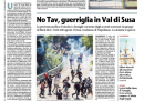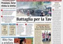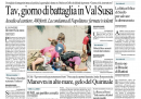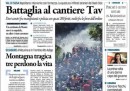 Le aperture di prima pagina dei maggiori quotidiani sono tutte dedicate agli scontri di ieri intorno ai cantieri dell’Alta Velocità in Val di Susa. Solo il Giornale si dedica ancora a un suo personale innamoramento per Michele Santoro, chissà quanto condiviso dai suoi lettori.