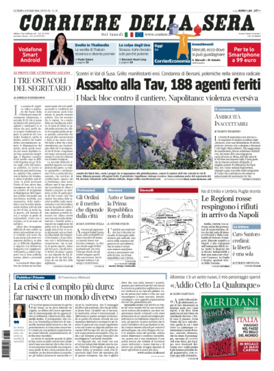 Le aperture di prima pagina dei maggiori quotidiani sono tutte dedicate agli scontri di ieri intorno ai cantieri dell’Alta Velocità in Val di Susa. Solo il Giornale si dedica ancora a un suo personale innamoramento per Michele Santoro, chissà quanto condiviso dai suoi lettori.