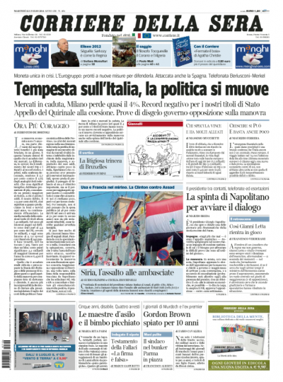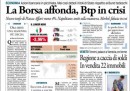 Sempre più unanimi i titoli, nella “tempesta” che sta sconvolgendo le borse di tutto il mondo in seguito alla crisi dei titoli di Stato italiani, anche se al Giornale concentrano le loro attenzioni su un dettaglio. Sui quotidiani sportivi, ha fatto invece effetto la presentazione leonina di Napoli.
