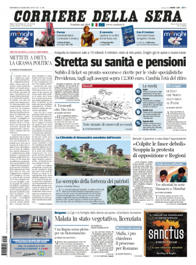 Sempre le questioni dell’economia nei titoli dei quotidiani maggiori, e scelte più personalizzate sugli altri: Tremonti sul Manifesto, Fini su Libero, Bersani sul Secolo, Draghi sul Riformista, Marina Berlusconi sul Giornale.