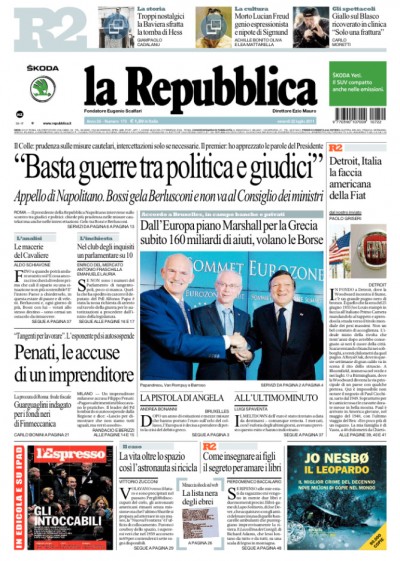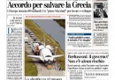 Prevale la Grecia, sulle prime pagine dei quotidani di oggi (Stampa e Messaggero hanno identico titolo), ma per il titolo più in evidenza ci sono anche altre scelte: il Mattino e il Manifesto privilegiano l’intervento di Napolitano sulla giustizia, il Riformista ha la Lega, Liberazione la guerra. E ci sono inattese similitudini tra Libero e Manifesto sugli indagati del PD.