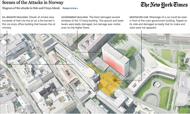 9.53 – La versione inglese di Wikipedia ha già una pagina con una breve descrizione di Anders Behring Breivik, l’uomo sospettato di aver organizzato gli attentati. La voce contiene un link verso un articolo di VG, dove si ipotizza che l’uomo utilizzasse la propria piccola azienda agricola come copertura per ottenere grandi quantità di fertilizzante, utilizzato spesso per la costruzione di ordigni esplosivi artigianali.