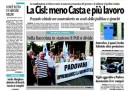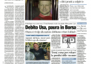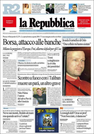 La gran parte delle prime pagine si divide fra tre notizie che, in giornate meno affollate di fatti e notizie, avrebbero potuto avere il titolo di apertura: gli sviluppi degli attacchi in Norvegia, con le indagini e la prima udienza di Anders Breivik; la fatica delle borse europee di fronte alla complicata trattativa sul debito statunitense; la morte di un soldato italiano in Afghanistan. Ci sono comunque giornali che fanno scelte diverse, a cominciare dalla stampa politica. Poi c’è il Mattino che apre con la “guerra” dichiarata da Obama alla camorra. Ed è divertente notare la prevedibilità di Libero e del Giornale, che fanno lo stesso identico boxino con lo stesso titolo e la stessa tecnica di riproduzione delle foto.