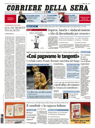 Nonostante le proteste di Bersani oggi il Corriere rilancia sulle presunte tangenti a Penati: gli altri si occupano soprattutto di economia e Nitto Palma
